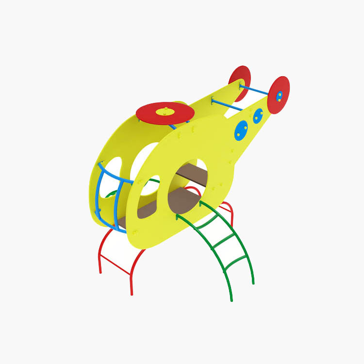 Комплекс включает в себя: полы выполнены из ламинированной фанеры с антискользящим покрытием, декоративные борта выполнены из влагостойкой фанеры, толщиной 18 мм, кромки фанеры тщательно шлифованы, окрашены в желтый цвет, стилизованы под вертолет, ограждение выполнено из труб диаметром 22 и 27 мм, лаз-лестницаПараметры: